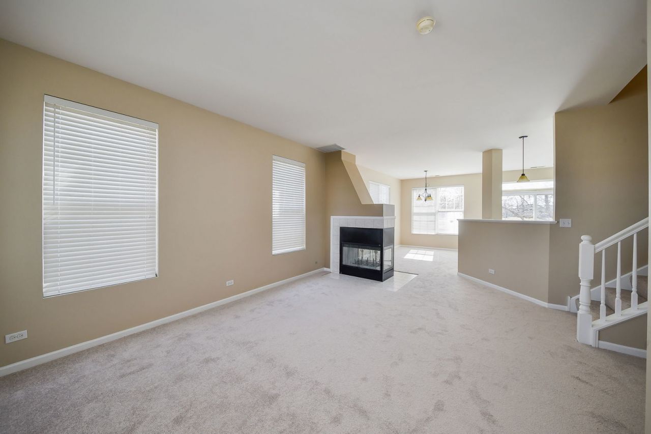 Fresh, move-in ready, and serving waterfront vibes, this beautifully updated three-bedroom, two-and-a-half-bath townhome in Heritage Meadows offers the perfect blend of comfort and style. Newly carpeted and freshly painted, the open floor plan flows effortlessly from the living and dining areas, anchored by a cozy see-through gas fireplace that adds warmth and character to both spaces. The functional kitchen features an island for casual mornings or entertaining, white appliances, a pantry cabinet for extra storage, and a charming backsplash that adds just the right touch of personality. Step outside and enjoy summer evenings dining on your patio overlooking stunning wooded waterfront views. Upstairs, the vaulted primary bedroom offers generous space, a full private bath, and a walk-in closet, while two additional well-sized bedrooms provide ample closet space and flexibility for guests, work-from-home needs, or hobbies. A convenient second-floor laundry area and additional linen closet add everyday practicality, and abundant storage throughout the home keeps everything organized. Located in a quiet community with walking paths and just minutes from parks, shopping, dining, Plainfield schools, and easy access to Route 59 and I-55, this home delivers peaceful living with everyday convenience. Being sold as-is, yet thoughtfully updated and ready for its next chapter. Furnace and air 2024.